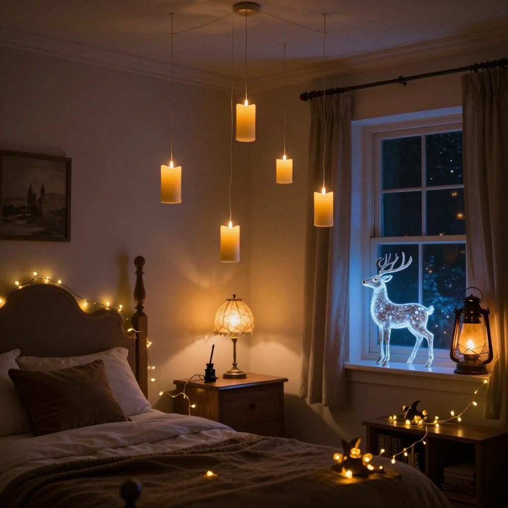 Layer your lighting. The magic is in the light. Combine overhead floating candles with bedside wand lamps, fairy lights along the headboard, and a Patronus nightlight in the corner. Multiple warm light sources at different heights create depth and enchantment.